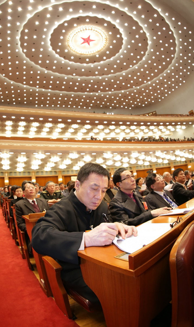 3月3日,中国人民政治协商会议第十二届全国委员会第一次会议在北京人民大会堂开幕。这是成龙委员在听会。