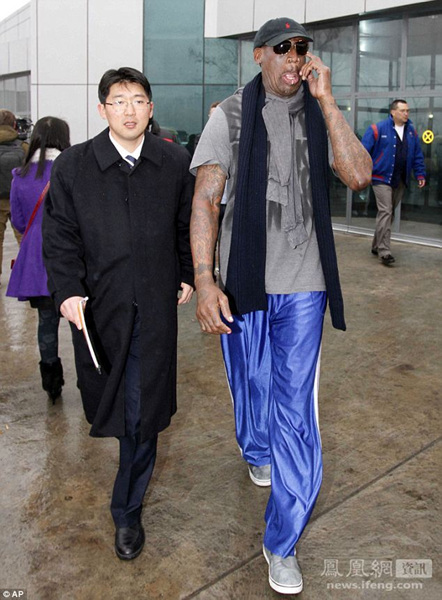 朝鲜劳动党机关报《劳动新闻》27日在第四版刊登了美国前NBA球员一行抵达朝鲜的新闻,并附上了罗德曼等人抵达平壤后在机场拍摄的合影。