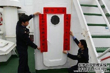 除夕午后,新华视点微博从全球征集近400条春联,由网友“知性的DONGDONG”“龙的年”“木晓文德堂”制作的三幅作品中选,由队员手书贴上海监船驾驶舱、 食堂、甲板,随海监船第一次于春节赴钓鱼岛海域巡航。